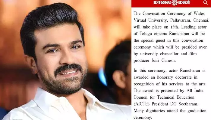 మెగా పవర్ స్టార్ రామ్ చరణ్ కి అరుదైన గౌరవం దక్కింది. చెన్నైలోని ఓ ప్రముఖ యూనివర్సిటీ ఆయనకు గౌరవ డాక్టరేట్ ప్రధానం చేయనుంది. చెన్నైలోని వేల్స్ వర్చువల్ యూనివర్సిటీ స్నాతకోత్సవ వేడుకలు ఈ నెల 13న జరగనున్నాయి. ఈ వేడుకలు సినీ నిర్మాత, యూనివర్సిటీ వైస్ చాన్స్లర్ అయిన ఈసరి గణేష్ ఆధ్వర్యంలో ఘనంగా నిర్వహించనున్నారు. ఈ కార్యక్రమానికి తెలుగు సినీ హీరో రామ్ చరణ్ తేజ్ ముఖ్య అతిధిగా హాజరుకానున్నారు.